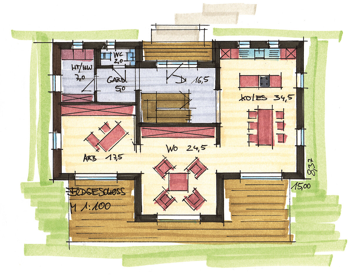 Eine großzügige und offene Grundrissgestaltung ist für das komfortable Leben einer Familie von besonderer Bedeutung. Aber erst durch das ausgewogene Angebot von gemeinsamen Flächen und individuellen Räumen wird dieses Haus zum Traumhaus. Während die Einen in der offenen Küche spielen, möchten sich die Anderen mit Buch und Wolldecke zurückziehen – das ist bei diesem Hausentwurf alles möglich.