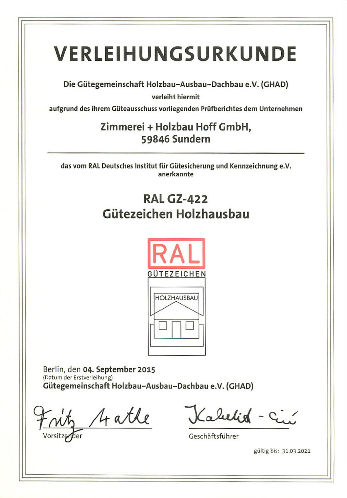 Hier haben wir für Sie unsere RAL Gütezeichen Holzbau Verleihungsurkunde und unser Übereinstimmungszertifikat der Überwachungsstelle für Wand, Decken und Dachtafeln hinterlegt.